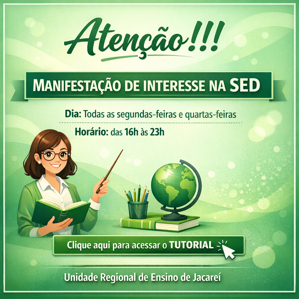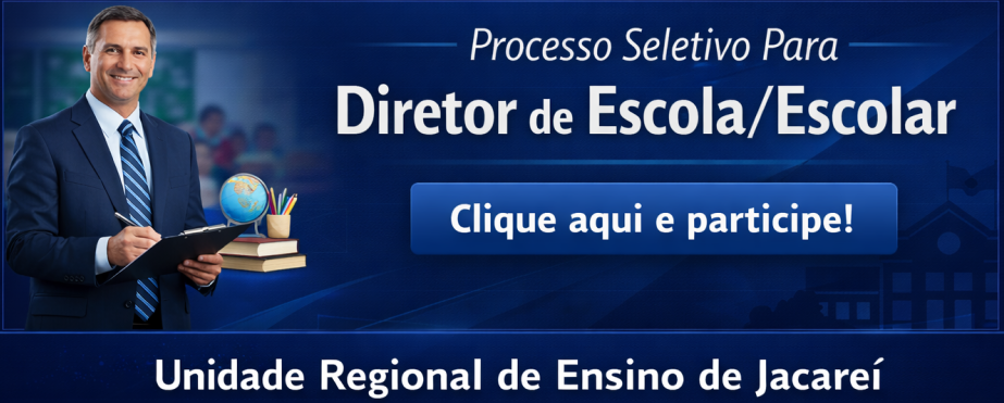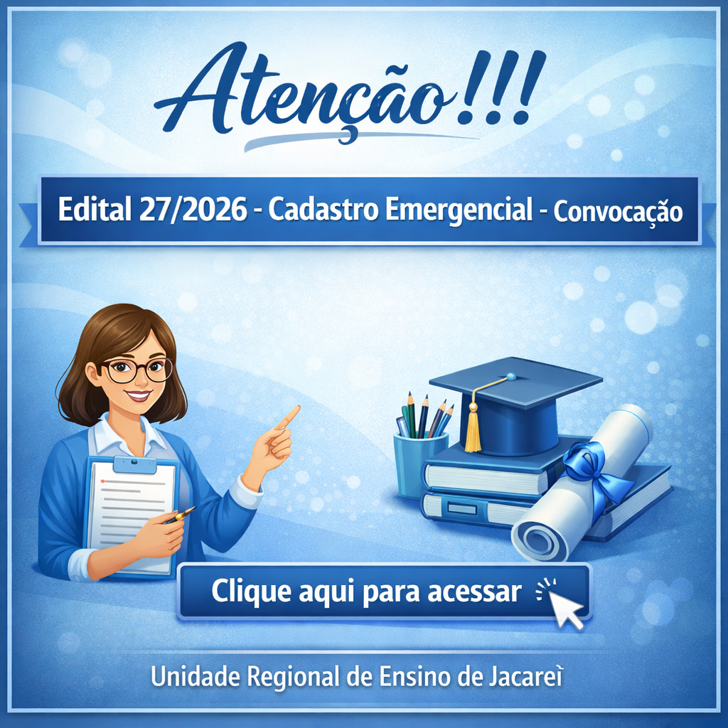 × × × × Não precisamos nos comunicar mais, precisamos nos comunicar melhor! ATENÇÃO - MANIFESTAÇÃO DE INTERESSE NA SED DIA: Todas as segundas-feiras e quartas-feiras. HORÁRIO: 16h às 23h CLIQUE AQUI para acessar o TUTORIAL ATENÇÃO: EDITAIS AOE - EDUCAÇÃO ESPECIAL ATRIBUIÇÃO DE AULAS 2026 CLIQUE AQUI CONHEÇA UM POUCO MAIS SOBRE A UNIDADE REGIONAL DE ENSINO DE JACAREÍ <<>> Informes da Unidade Regional de Ensino de JacareíEdital Nº 85 /2026 – Professor Interlocutor de LIBRAS. Leia mais »Edital nº 84 /2026 – Professor Auxiliar – EDUCAÇÃO ESPECIAL – (cumprimento … Leia mais »Edital 27 – Cadastro Emergencial – ConvocaçãoLista de convocados – complemento do Edital 27: Atribuição de Aula 2026 – Banco de Talentos … Leia mais »Acesse publicações mais antigas clicando aqui